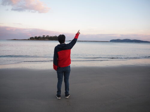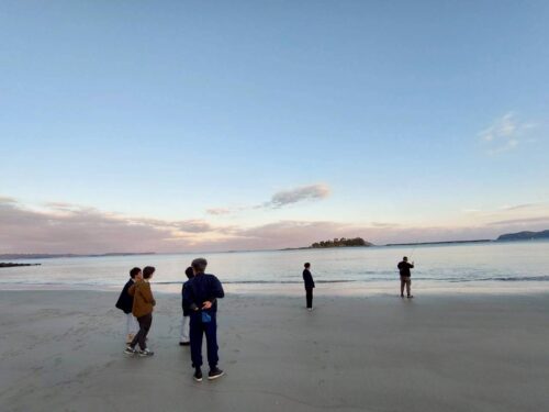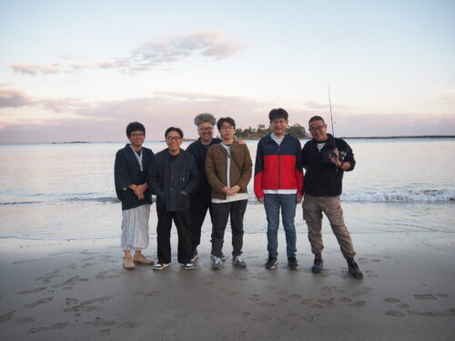 ということで、当たり前のように全員で朝集合し、旅館裏の海岸まで散歩に出かけました。夜明け頃の海辺散歩は最高でした。しかも魚釣りで有名な糸島の海岸です。