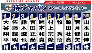 最近のメジャーリーグの流行である、1、2番にホームランバッターを配置する打順。ちょっと前は2番打者最強説だったけど、今は1番に置いて、なるべく打席が回ってくるように打順を組むのがトレンドです。我がチームJAPANも流行に乗って、1番に指名打者DHとして大谷選手を持ってきました。ドジャースでも1番打者なので、大谷選手からしたら慣れた打順です。